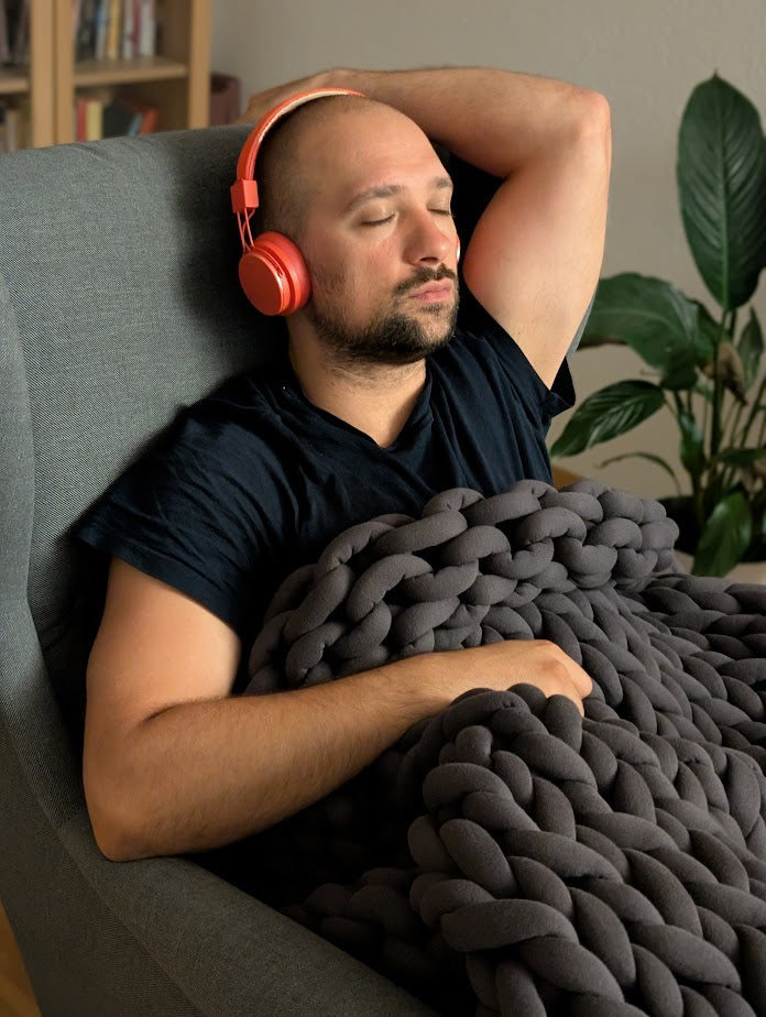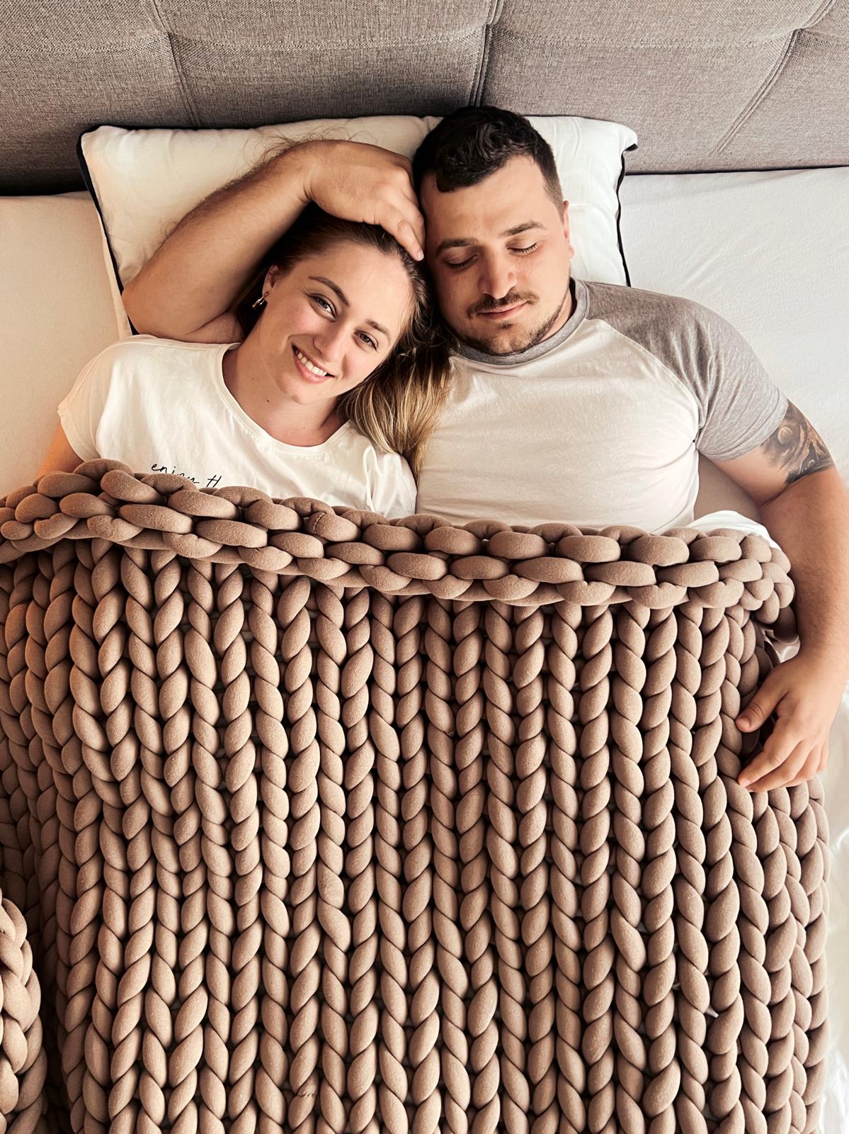 Unsere Decke hat eine angenehme Grösse für eine Person und passt quer auch zu zweit. Das flexible Strickdesign schmiegt sich eng an den Körper und übt sanften Druck aus. Für mehr Tiefenwirkung kannst du sie über deine Bettdecke oder direkt auf der Haut verwenden.